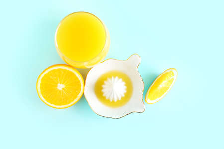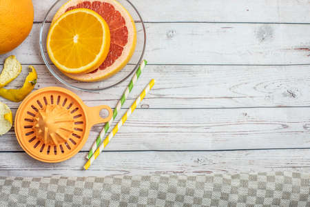 Fresh slices citrus fruit and orange manual juicer on light wooden table. Top view. With copy space.
