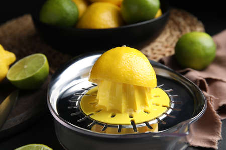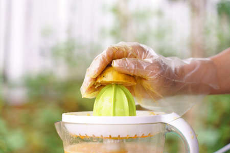 Close up of young woman hands doing fresh lemonade, squeezing juice from citrus fruit, juicer.