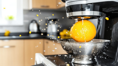 A juicy orange being squeezed to make fresh juice, with droplets flying around in a bright kitchen setting