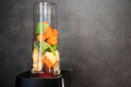 Blender with fresh vegetables. Sliced celery, apple and carrot in a blender cup for a smoothie. Healthy food. Copy space