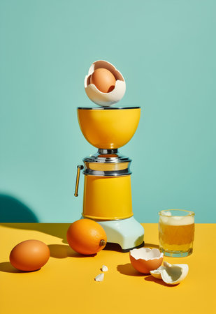 coffee machine with eggshell and glass of juice on yellow and blue background
