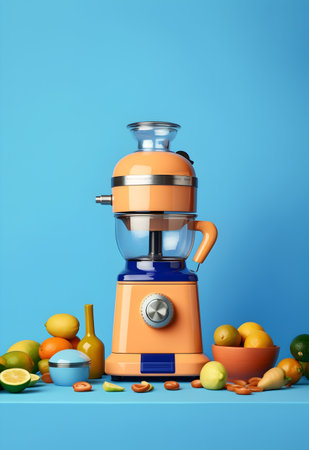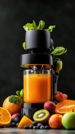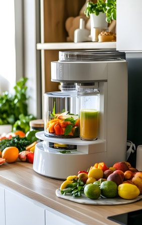 A modern kitchen appliance with fresh vegetables and fruits ready for juicing, promoting healthy lifestyle and home cooking.