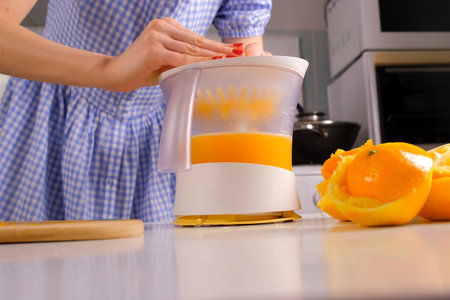 Woman squeezing oranges using electric juicer in kitchen at home. Healthy vegan ripe fruit juice, drink beverage natural vitamins from food. Many fresh halves of oranges tangerines on table.