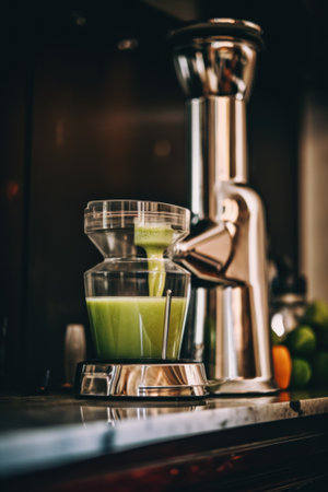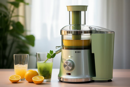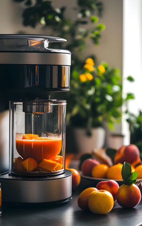 A modern juicer preparing fresh juice, surrounded by vibrant fruits and greenery in a cozy kitchen setting.