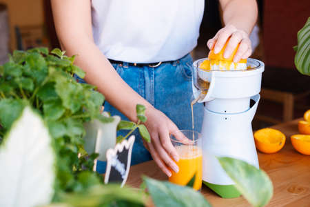 Unrecognizable woman making fresh orange juice in a kitchen full of plants.