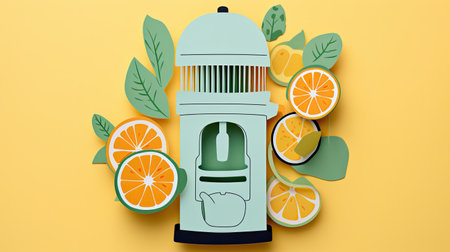 A vibrant kitchen scene featuring a bright yellow citrus juicer surrounded by fresh oranges and limes, highlighting a healthy lifestyle and refreshing drinks. Perfect for food photography.