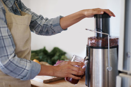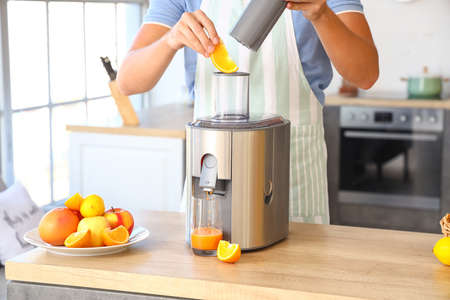 Making fruit juice with juicer machine at home in kitchen, healthy eating lifestyle concept