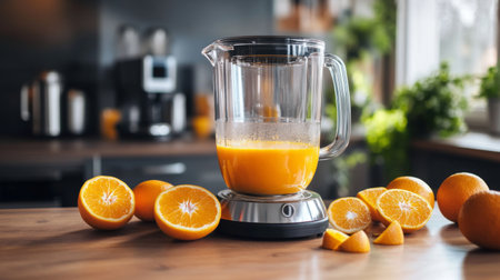 Hands squeeze oranges into a blender for a nutritious drink, surrounded by fresh fruits and vibrant colors in a cozy kitchen setting.