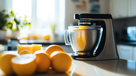 A sleek lemon juicer sits on a kitchen counter surrounded by fresh lemons, illuminated by sunlight, creating a warm and inviting atmosphere perfect for healthy living.