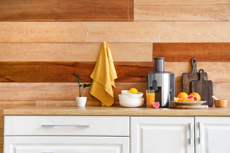 Modern electric juicer and various fruit on kitchen counter, healthy lifestyle concept