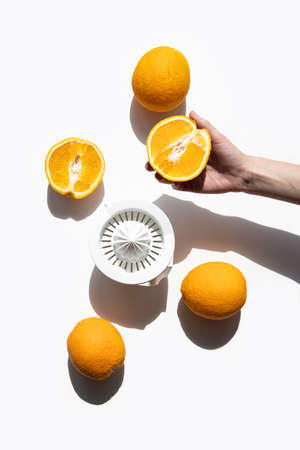 Female hand squeezes juice from oranges in a hand bowl on a white background. Top view, flat lay.