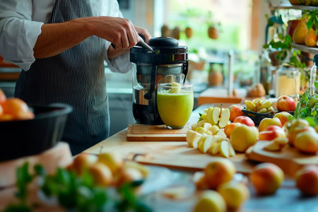 A person is making juice in a kitchen filled with fresh fruits, including apples and pears. Sunlight streams in, creating a warm, inviting atmosphere perfect for healthy cooking.