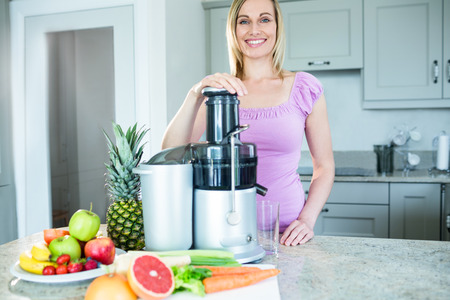 Trying out that juice diet. a woman standing in a kitchen making fresh juice with a juicer.