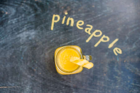 Pineapple cocktail with a slice of pineapple on a wooden background and inscription in chalk pineapple. Tropical cocktail concept.