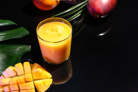 Glass of healthy Orange juice with pulp and sliced fruits isolate on black background with purple flowers. Orange juice and fresh fruits on table.