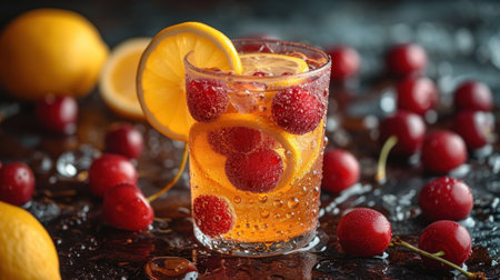 Refreshing Summer Beverage With Cherries and Lemons Set on Ice Outdoors