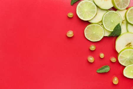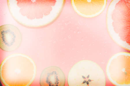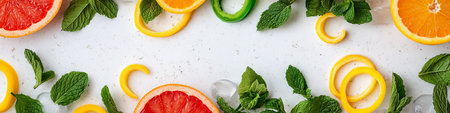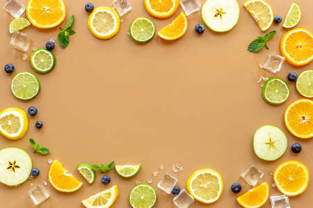 Frame of slices citrus fruits and berries for cocktail or juice, top view