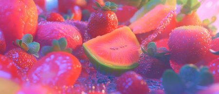 Vibrant neon fruit designs on a pop-art background create a striking visual experience, showing electric blue and pink hues that captivate viewers.