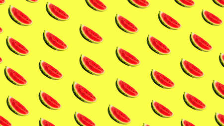 Creative background of watermelon slices on yellow sunny background. Fresh watermelon with seeds. Summer fruit background concept.