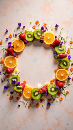 Colorful fruit and flower wreath featuring oranges, strawberries, kiwis, and purple flowers. That the image is generated using AI.