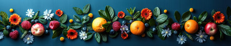 Banner of fresh fruits and flowers on dark blue background. Top view
