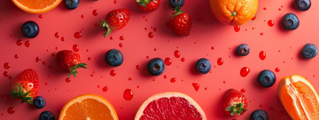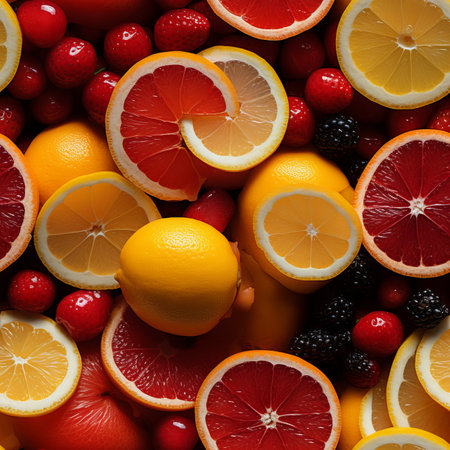 bright and juicy strawberries and cherries with citrus slices in a seamless pink background design