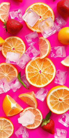 Colorful citrus and ice cubes create a refreshing summer vibe on a bright pink background