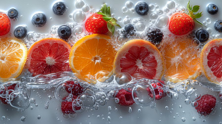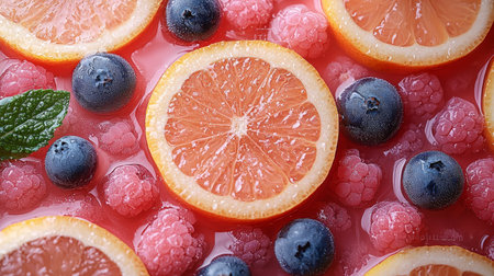 A close-up of fresh citrus slices, raspberries, blueberries, and mint leaves in a vibrant and refreshing fruit arrangement with natural detail.
