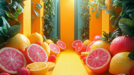 A vibrant display combining colorful fruits like pineapple, grapefruit, and strawberries with bright bath products, creating a fresh and lively visual on a yellow and blue background.