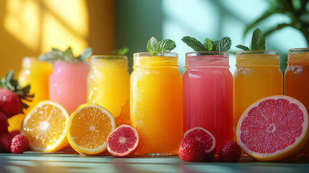 A lineup of freshly squeezed juices in vibrant jars, surrounded by sliced citrus fruits, creating a refreshing and colorful display.