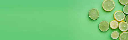 Slices of fresh lime and lemon on a blue background with water drops. Citrus background.