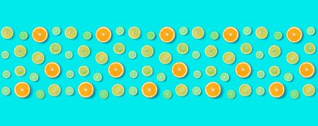 top view of ripe juicy orange slices on colorful background, panoramic crop
