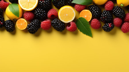 A colorful assortment of fresh fruits and berries is displayed on a soft pastel surface, creating a vibrant and inviting arrangement for any occasion.