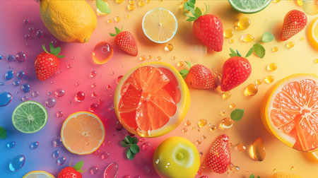 An artistic and colorful explosion of sliced tropical fruits and liquid splashes on a vibrant background.