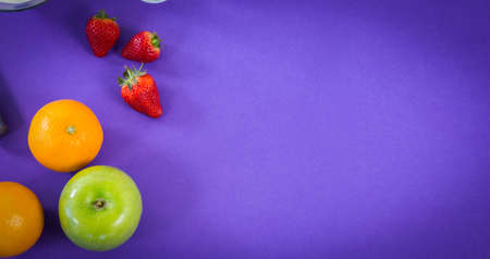 Fresh organic fruits background. Healthy eating concept. Flat lay.