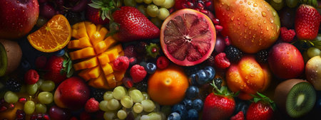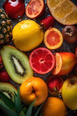 A colorful array of ripe tropical and seasonal fruits with varied textures, vibrant colors in detailed close-up