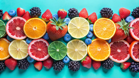 Colorful and vibrant assortment of citrus fruits and berries arranged in a horizontal line on a teal blue background.