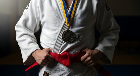 Focused judoka in training dojo for martial arts practice and competition preparation