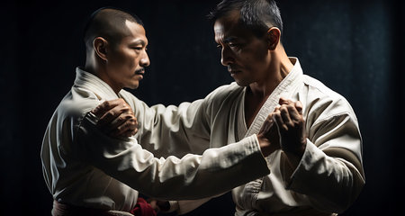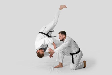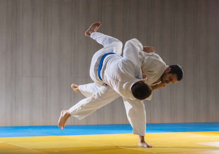 Two judo fighters showing technical skill while practicing martial arts in a fight club. The two fit men in uniform. fight, karate, training, arts, athlete, competition concept