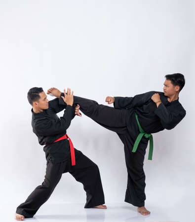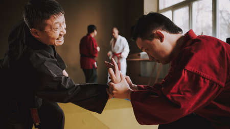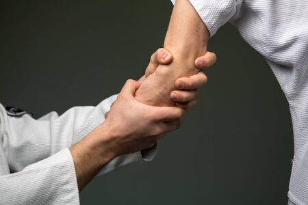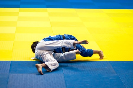 The two boys fighting at Aikido training in martial arts school. Healthy lifestyle and sports concept