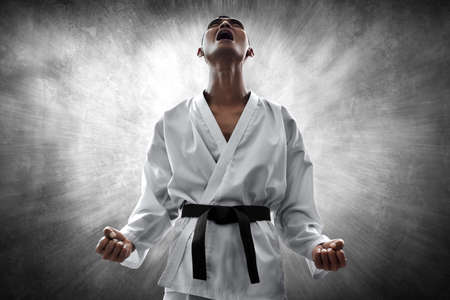 Male martial artist wearing white gi, black belt in studio against black backdrop looking serious. Combat, discipline, strength, focus, training, resilience, determination