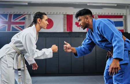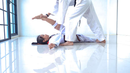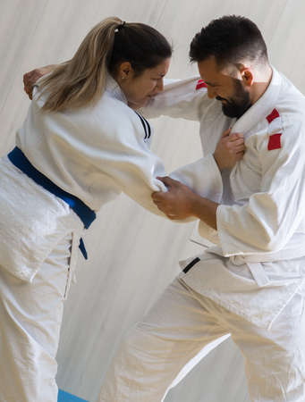 Martial arts. Sparing Portners. Sport man and woman in white kimono train judo throws and captures in the sports hall