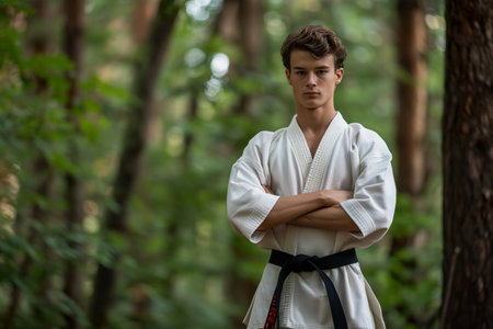 A young boy, wearing a karate kimono and black belt, poses as a winner in a forest.