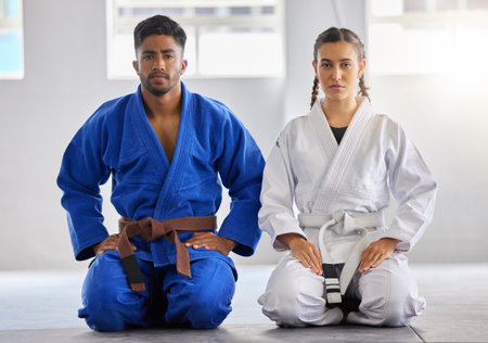 Karate, man and woman in portrait together with focus determination for fitness, wellness or training. Couple, martial arts and sitting knees in gym, dojo or club for exercise, fight sport or workout