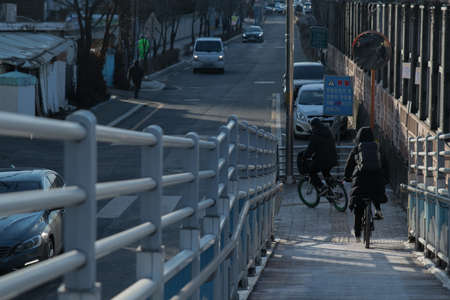 people holding bicycle to cross overpass in winter