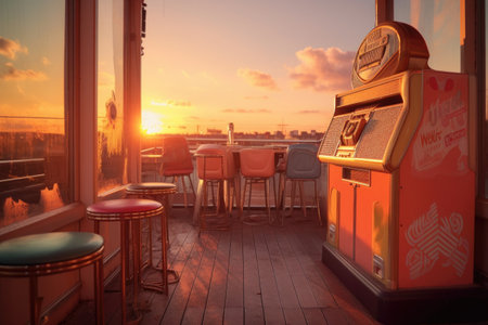 retro jukebox on a rooftop terrace at sunset, created with generative ai