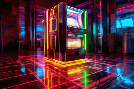 neon-lit jukebox reflecting on a shiny floor, created with generative ai