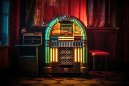 vintage jukebox illuminated in dimly lit room, created with generative ai