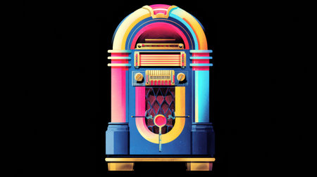 Detailed and stylized rendering of an old jukebox. It is colorful, featuring red, blue, and yellow, against a solid black background.