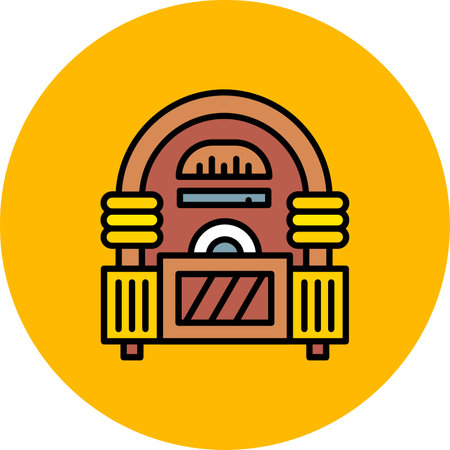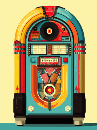 A vintage jukebox stands prominently, showing its bright yellow, red, and blue color scheme, along with intricate details and a nostalgic aesthetic.